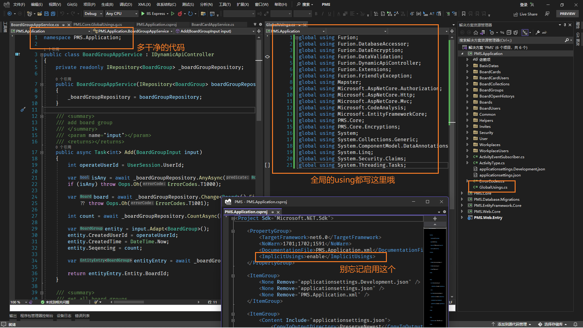 这样 GlobalUsings.cs 所在的项目 .cs 文件就无需重复 using 了,大大的提高开发效率,也让代码变的更加简洁。