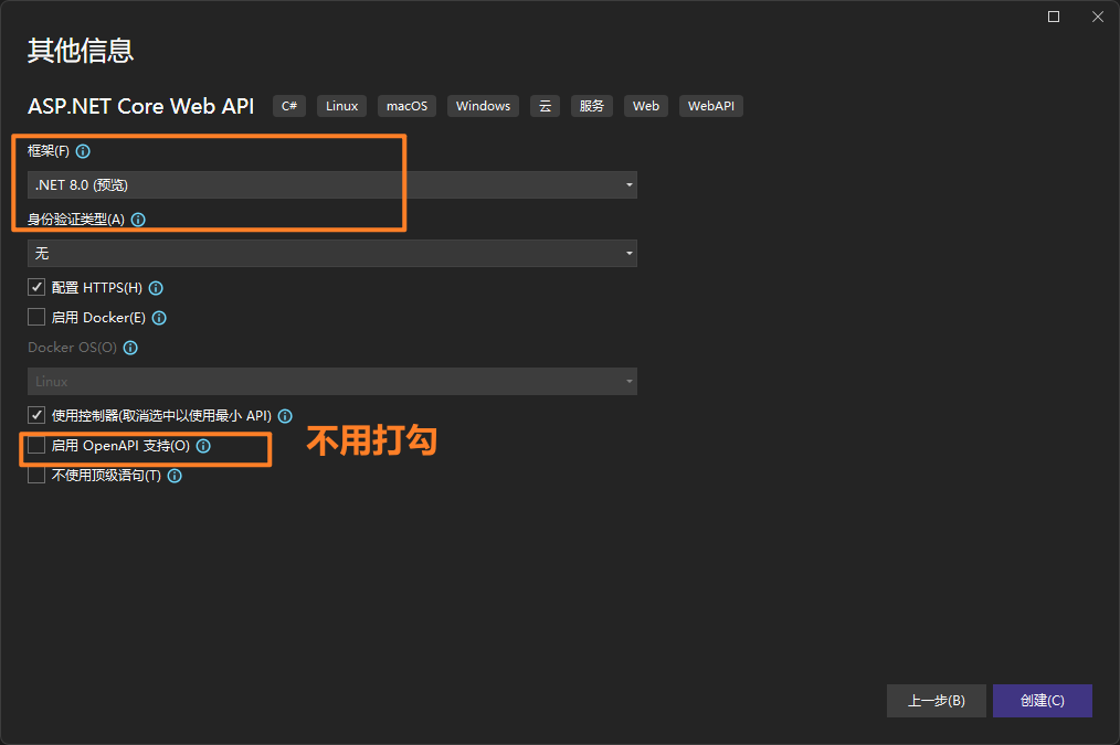 Furion 已经内置了 Swagger 规范化库,所以创建时无需勾选 Enable OpenAPI support 选项。否则提示版本不一致产生冲突。