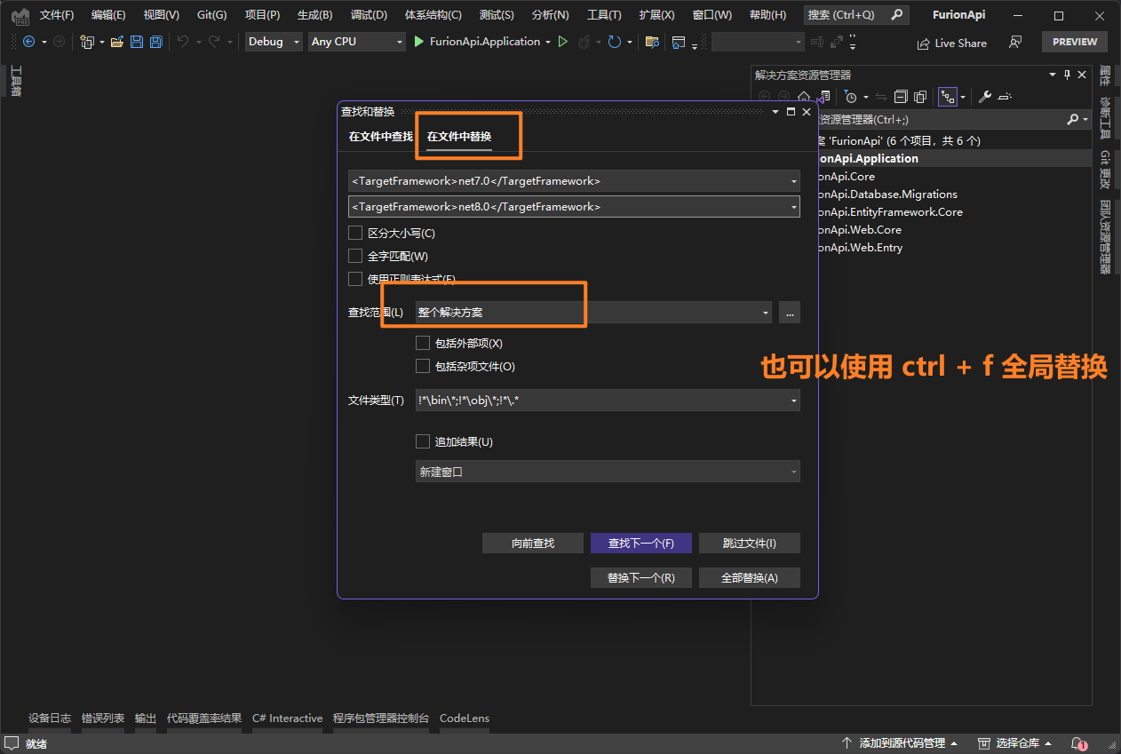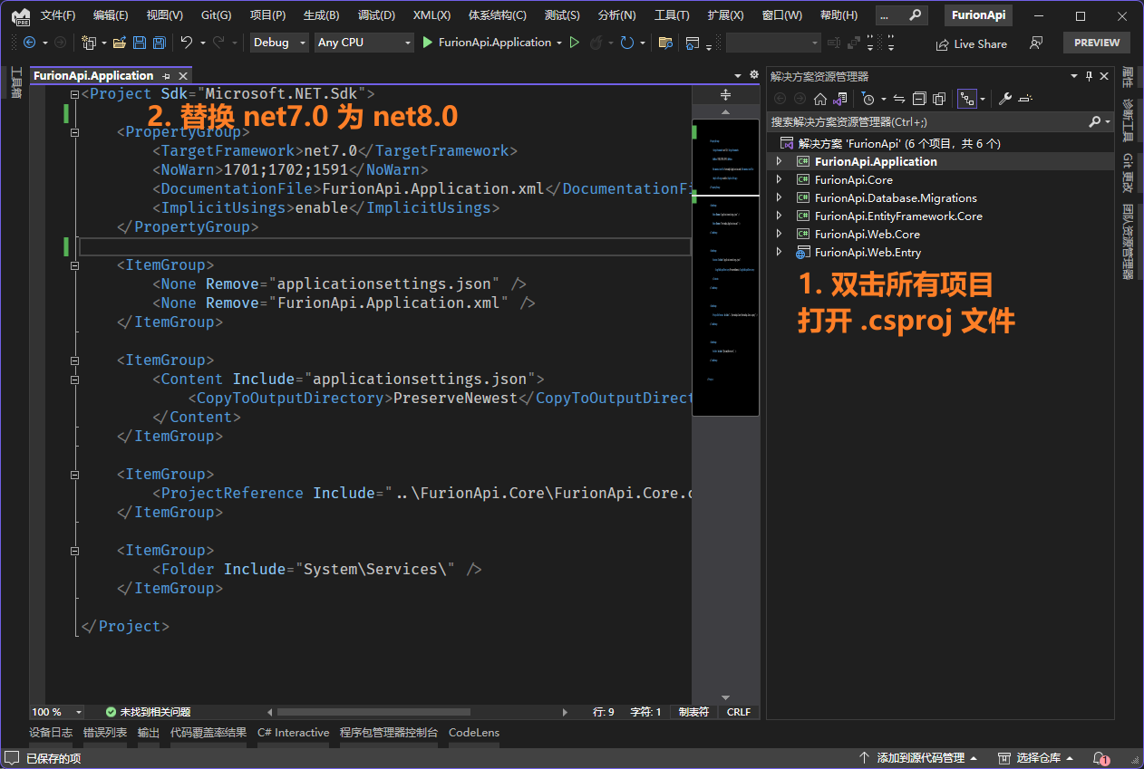 编辑解决方案所有项目的 .csproj 文件,并替换 <TargetFramework>net7.0</TargetFramework><TargetFramework>net8.0</TargetFramework>,如: